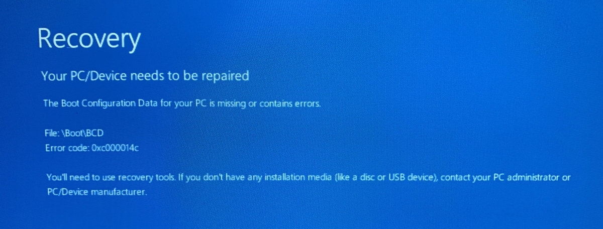 これは、Windowsの起動に必要な「BCD (Boot Configuration Data)」が壊れているか見つからないという状態です。これは以下のような原因で起こることがあります: